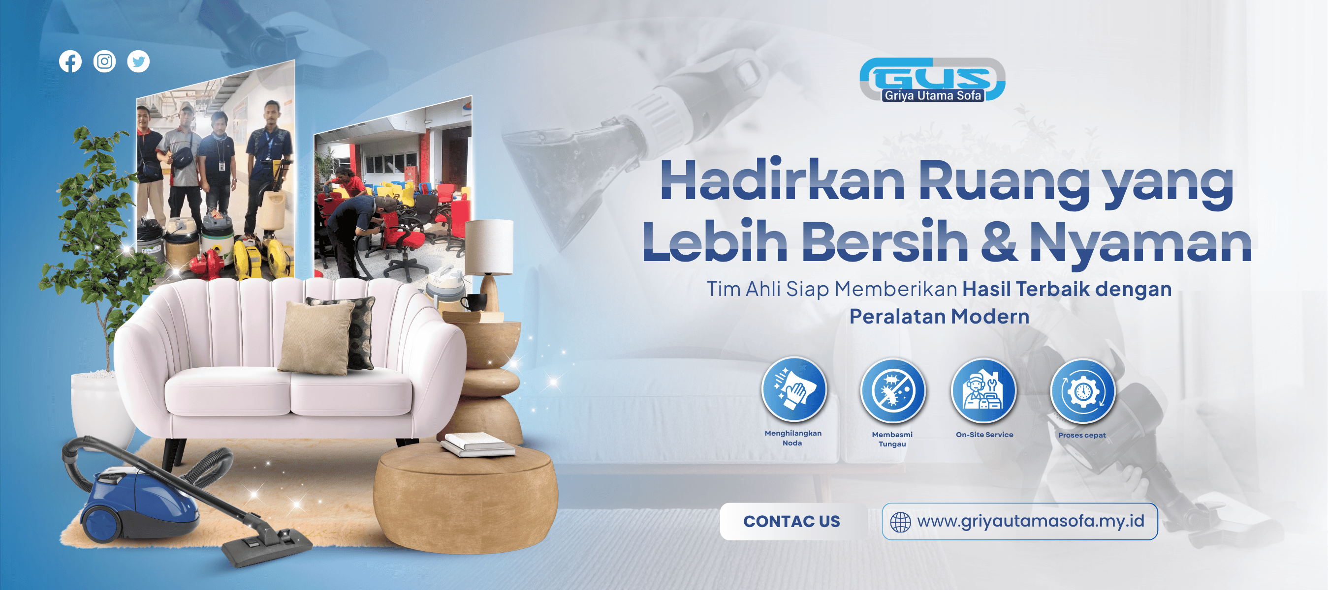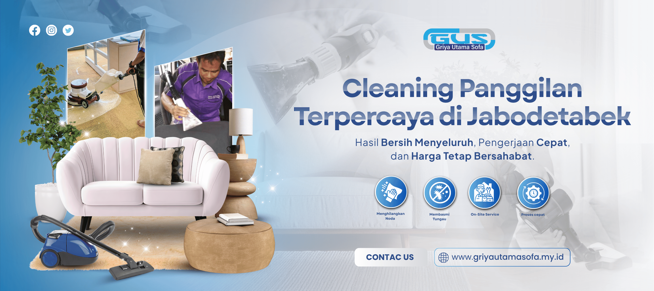 GUS – Griya Utama Sofa menyediakan layanan cleaning panggilan profesional yang melayani area Jabodetabek. Kami membantu menghadirkan hunian dan ruang kerja yang lebih bersih, higienis, dan wangi dengan proses kerja cepat, rapi, dan hasil yang maksimal.